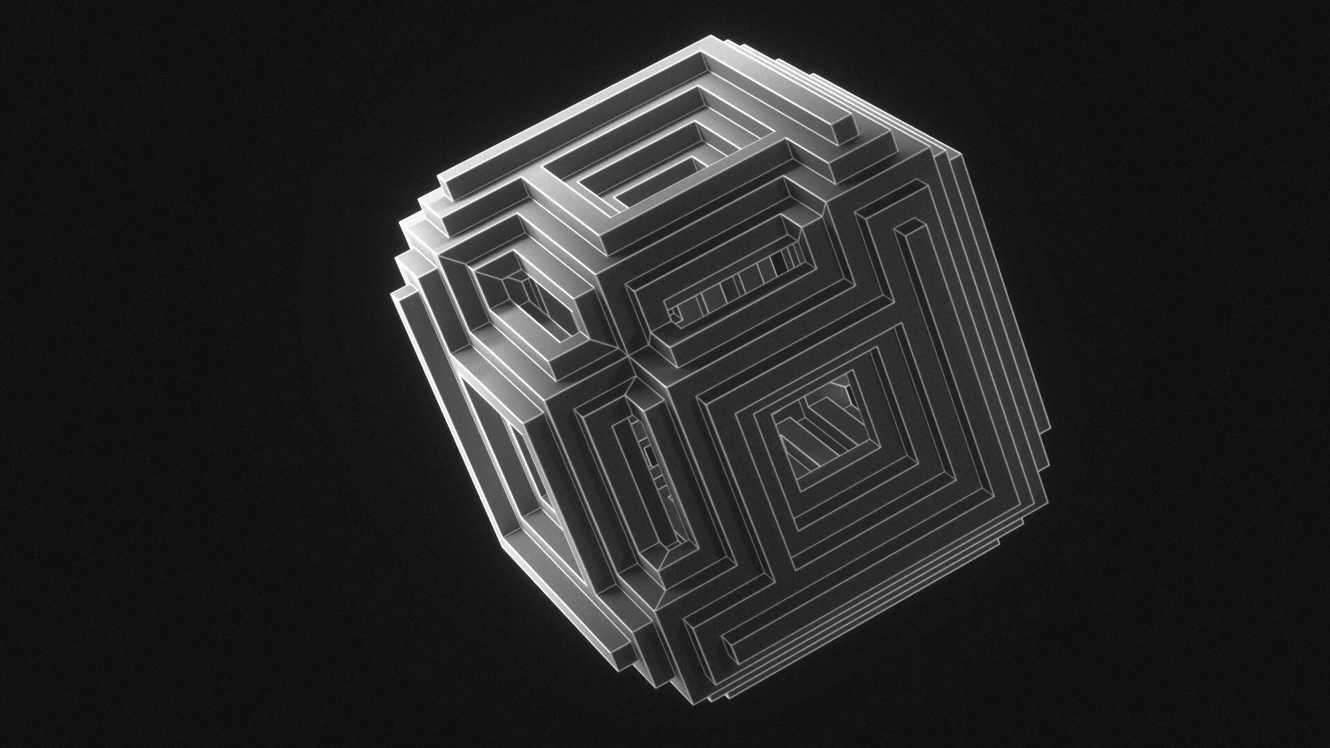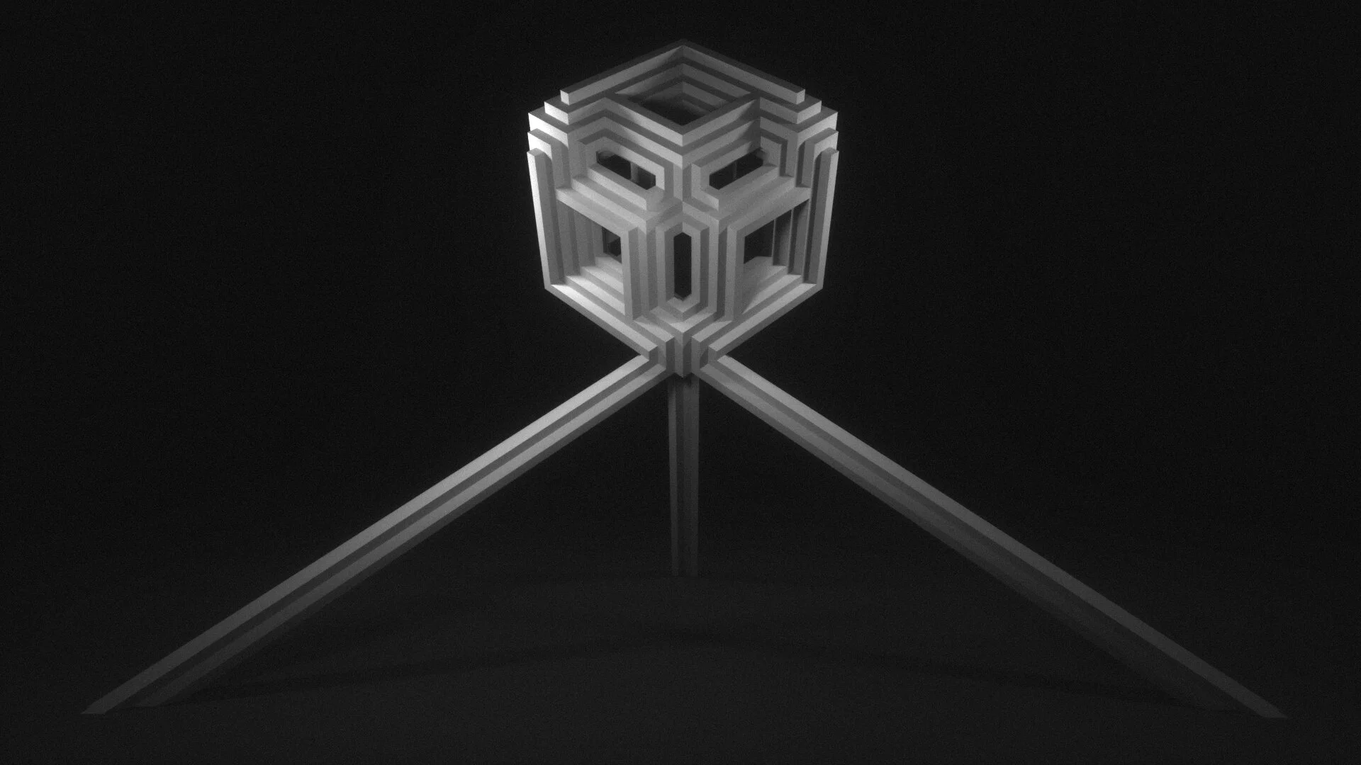 The ISO sculpture was designed as an immersive room for viewers to be lost within geometric forms. Munko and myself wanted to create a piece of Geometry that was inspired by the Bizmuth crystal while obeying the Isometric rulebook – and also had a presence of its own by resembling a geometric mask – a pensive mathematical portrait that could emote on its own. This sculpture was then hoisted by a pedestal, an Isomorphic tripod, providing a pathway for the travel of animated light to scan the form on multiple planes. Lastly, a triangular mirror was placed underneath the tripod base and was also mapped by the six projectors – which gave the form an analog prismatic and caustic reaction that bounced organic shapes of light throughout the room.