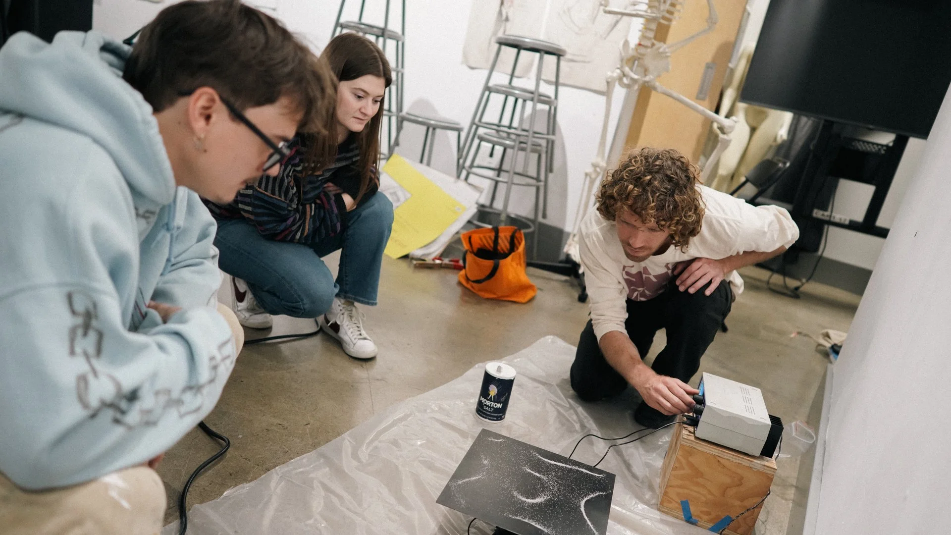 The workshop began with various practical effects process for generating imagery. The students were shown how to create animated shapes using cymatic sand, how to manipulate visuals on a monitor using camera optics and how to distort digital content using analog glitch tools. The students were able to use both the Tachyons+ Dreamweapon Module and the BPMC HDK-01 module for their glitch processing. The second workshop day featured digital effects demos using both After Effects and Cinema 4D, showing students how to manipulate the content they shot on the first day.