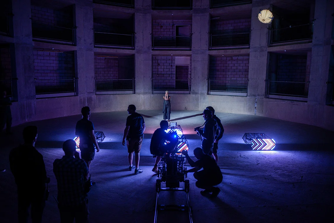 Lucid was filmed 5 stories below the streets of Islington Green, London in Collins Music Hall. Four screen-wielding drones, the first of its kind produced by the fine chaps at Flying Screens Ltd were the heroes of the show. To light the surrounding coves of the subterranean space, dozens of LED strips and several strobe lights provided the illumination to compliment the drones. A speaker system was installed to play the track entitled ‘Glue’ – produced by the UK duo Bicep, which was tightly choreographed by the great Aaron Sillis and performed by the most fabulous dancer Zakiya.