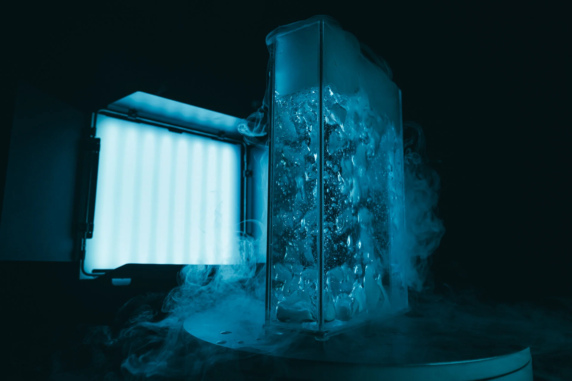 The next phase of the Peak Pro journey involved filtration, a process where dab smoke is filtered through water in order to cool the vapor. We used dry ice to create thick smoke bubbles, which we filmed in various water containers. The most difficult angle was using our Laowa 24mm probe lens and submerging it into a vertical vase of bubbling water.